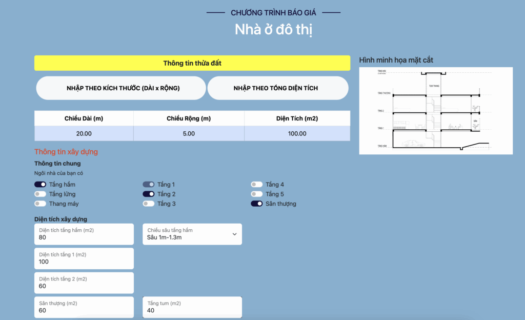 Dự toán vật tư thô & hoàn thiện: Cho phép khách hàng lựa chọn các gói vật tư từ tiết kiệm đến cao cấp.